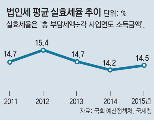 9일 국세청 국세통계연보 등에 따르면 2015년 국내 기업들이 낸 법인세 평균 실효세율은 14.5%로 전년(14.2%)보다 0.3%포인트 증가했다. 전년도에 흑자를 본 기업들이 거둔 총소득(275조 원)으로 법인세 납부세액(40조 원)을 나눈 수치다.