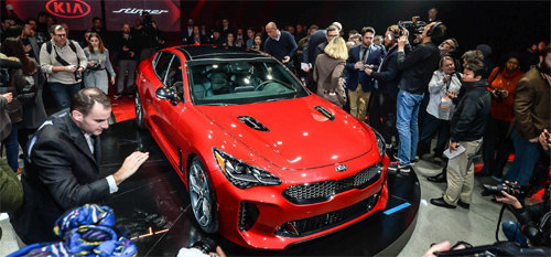 기아자동차가 8일(현지 시간) ‘2017 북미국제오토쇼(디트로이트 모터쇼)’ 사전 미디어 행사에서 프리미엄 퍼포먼스 세단 스팅어를