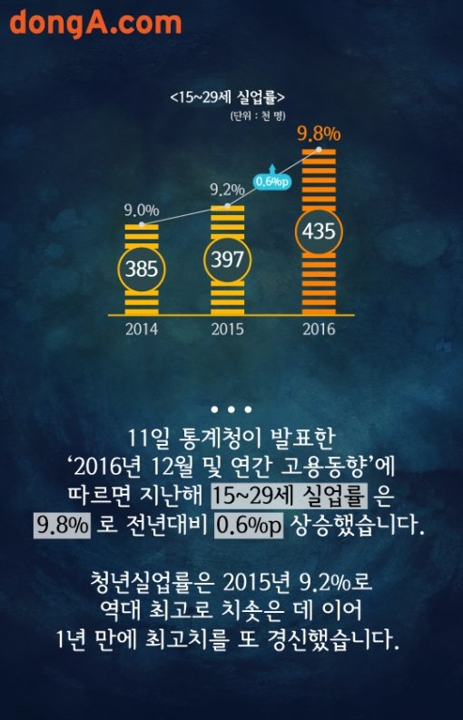 11일 통계청이 발표한 ‘2016년 12월 및 연간 고용동향’에 따르면 지난해 15~29세 실업률은 9.8%로 전년대비 0.6%p 상승했습니다. 청년실업률은 2015년 9.2%로 역대 최고로 치솟은 데 이어 1년 만에 최고치를 또 경신했습니다.