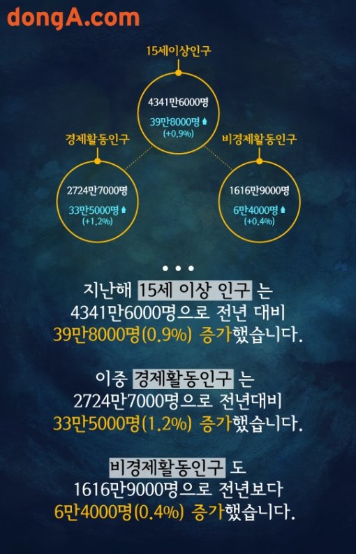 지난해 15세 이상 인구는 4341만6000명으로 전년 대비 39만8000명(0.9%) 증가했습니다. 이중 경제활동인구는 2724만7000명으로 전년대비 33만5000명(1.2%) 증가했습니다. 비경제활동인구도 1616만9000명으로 전년보다 6만4000명(0.4%) 증가했습니다.