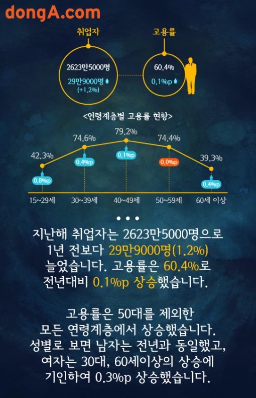 지난해 취업자는 2623만5000명으로 1년 전보다 29만9000명(1.2%) 늘었습니다. 고용률은 60.4%로 전년대비 0.1%p 상승했습니다. 고용률은 50대를 제외한 모든 연령계층에서 상승했습니다. 성별로 보면 남자는 전년과 동일했고, 여자는 30대, 60세이상의 상승에 기인하여 0.3%p 상승했습니다.
