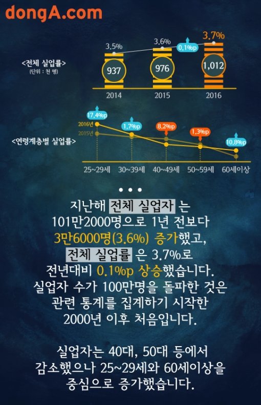지난해 전체 실업자는 101만2000명으로 1년 전보다 3만6000명(3.6%) 증가했고, 전체 실업률은 3.7%로 전년대비 0.1%p 상승했습니다. 실업자 수가 100만명을 돌파한 것은 관련 통계를 집계하기 시작한 2000년 이후 처음입니다. 실업자는 40대, 50대 등에서 감소했으나 25~29세와 60세이상을 중심으로 증가했습니다.