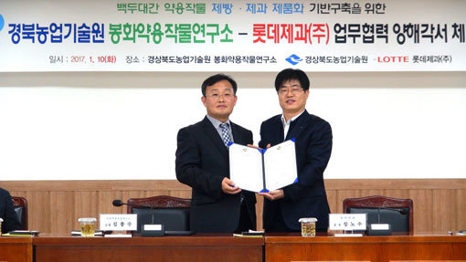 롯데제과(대표이사 김용수)와 경상북도 농업기술원은 10일 봉화약용작물연구소 강당에서 양측의 관계자와 농업인 등 20명이 참석한 가운데 백두대간 약용작물 제빵 제품화 기반 구축 MOU를 체결했다. 이날 MOU 체결로 롯데제과는 청정지역에서 재배된 좋은 약초를 이용해 다양한 건강 빵 제품을 개발해 블루오션을 창출하게 됐다. 그 첫 제품으로 1월 중에 영주의 강황, 안동의 돼지감자, 예천의 천마를 원료로 한 빵 제품을 선보일 계획이다.