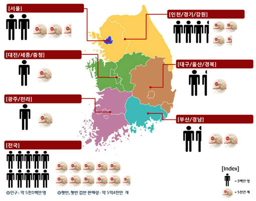 지난달 출시 20주년을 맞은 ‘햇반’이 최근 5개간의 전국 지역별 판매량을 토대로 만든 ‘전국 햇반 지도’를 공개했다. 2012년부터 지난해 11월말까지 약 5년간의 지역별 판매량을 분석했다. 전국에서 가장 판매량이 많았던 경기·강원 지역은 약 1억7400만개가 넘는 판매량으로 전국 판매량의 32.4%를 차지했다. 서울 지역이 약 1억2900만 개의 판매량으로 2위, 부산·경남, 대구·경북 등이 뒤를 이었다. 부산·경남의 경우 전체 판매량은 3위였지만 1인당 판매량은 전국에서 가장 많은 13.5개였다(2위 서울 13개).