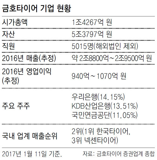 금호타이어는 지난해 3분기(7∼9월) 매출 7101억 원, 영업이익 95억 원을 기록했다. 매출은 2015년 같은 기간보다 다소 줄었지만 영업이익은 흑자 전환했다. 국내 타이어 업계에서 매출 기준으로 1위 한국타이어에 이어 2위다. 하지만 최근 3위 넥센타이어가 금호타이어를 바짝 추격하고 있다. 넥센타이어의 지난해 3분기 매출은 4702억 원, 영업이익은 654억 원이었다. 금호아시아나그룹 관계자는 “박 회장이 내부적으로는 자금 조달 방안을 마련 중이고 본입찰 과정을 지켜보며 단계적으로 적절하게 대응해 나갈 것”이라고 말했다.