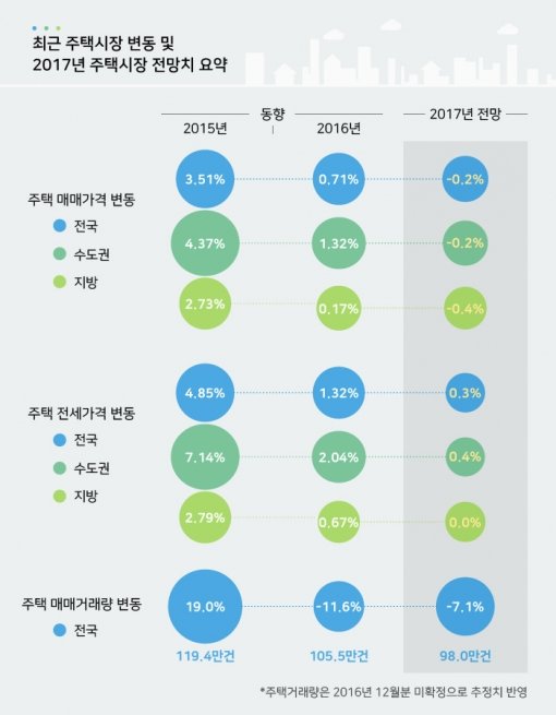 한국감정원 부동산연구원이 12일 발표한 ‘2016년도 부동산시장 동향 및 2017년 주택시장 전망’ 보고서에 따르면 올해 주택매매 시장은 거래량이 7.1% 줄어든 가운데 전년보다 0.2% 하락하고, 전세시장은 0.3% 소폭 상승할 것으로 예측됐습니다.