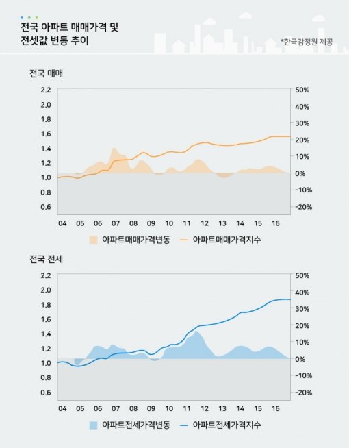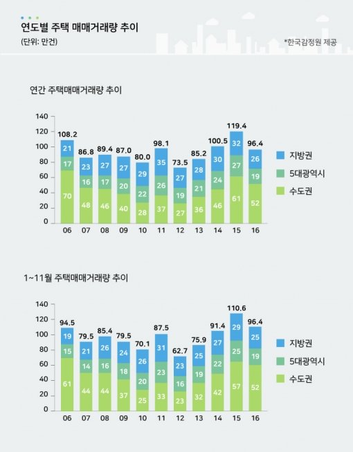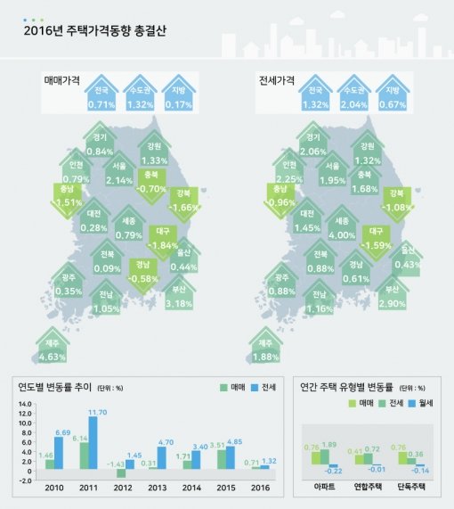 한편, 한국감정원에 따르면 지난해 주택매매가격은 2015년(3.5%)에 비해 상승률이 둔화됐긴 했지만 아파트 0.8% 등 상승세를 유지했습니다. 거래량은 지난해 11월 기준 96만4000건으로 1년 전 같은기간(110만6000건)보다 감소했습니다. 또 지난해 전세가격은 아파트 1.9%, 주택 1.3% 등 상승세를 보였습니다.