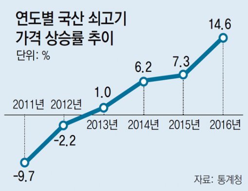 구제역이 유행했던 2000년(19.9%)과 2002년에 급등했던 쇠고기값은 2004년 5.6% 오르는 데 그치며 안정세를 보였다. 이후 미국산 쇠고기 수입이 재개된 2008년(―0.1%)을 비롯해 2011년(―9.7%), 2012년(―2.2%) 등 값이 떨어진 해도 있었다. 하지만 2013년 1.0% 오른 것을 시작으로 매년 상승폭을 키우고 있다.