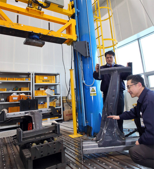 10일 오후 경기 화성시 남양읍 현대연구소로 현대·기아자동차 남양연구소. 충돌 사고와 비슷한 상황을 만들어 차체의 강도와 안전도를 시험하는 장비인 고속충격시험기 옆에 연구원들이 모여 있었다. 장비 아래쪽에 초고장력(超高張力) 강판으로 만든 승용차 측면 뼈대(센터필러)를 고정시켜 놓고 위에서 무쇠 추를 낙하시켰다. 그 뒤 차체가 얼마나 찌그러지거나 망가졌는지를 분석하는 것이다. 이날 시험한 센터필러는 현대·기아차의 신차에 적용될 차체였다.