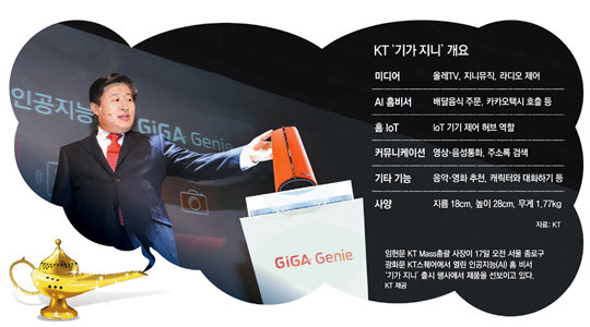 KT는 17일 서울 종로구 광화문 KT스퀘어에서 ‘기가 지니’ 출시 행사를 열고 이날부터 예약 가입을 받기 시작했다. 기가 지니의 본체 자체는 스피커형이어서 앞서 나온 아마존의 ‘에코’나 구글의 ‘구글 홈’과 마찬가지다. 하지만 KT 측은 앞선 제품들이 음성 기반이었던 것과 달리 기가 지니는 TV와 음성을 합친 ‘시청각’ 기반으로 하고 있다고 강조했다. KT가 기가 지니를 두고 ‘세계 최초 인공지능 TV’로 부르는 이유다.