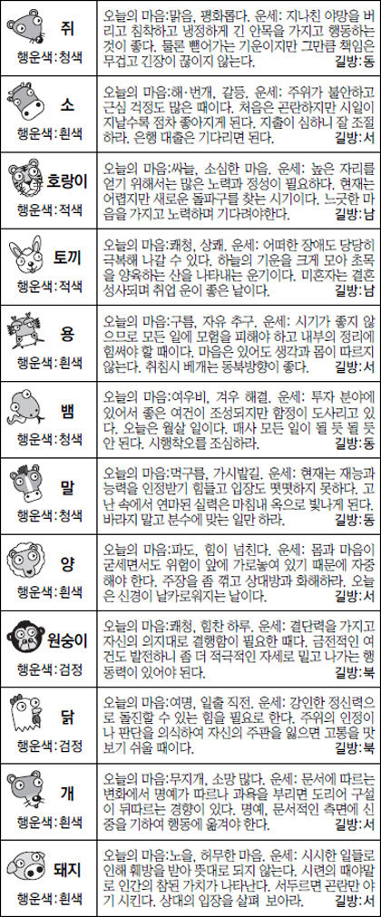 [스포츠동아 오늘의 운세] 2017년 1월 20일 금요일 (음력 12월 23일)