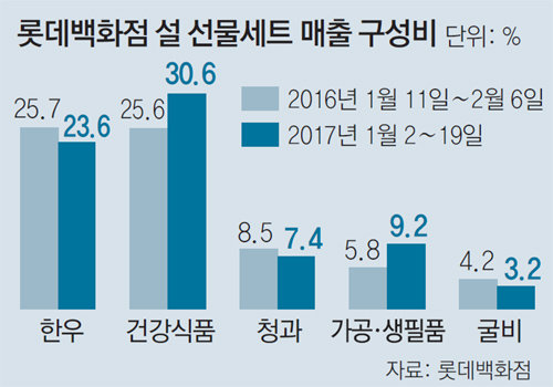 롯데백화점에 따르면 지난해 설 선물세트 매출 비중 1위였던 한우 선물세트는 올해 건강식품 세트에 1위 자리를 빼앗긴 상태다. 한우, 굴비, 청과 등 전통적으로 인기가 높았던 선물세트의 매출 비중은 지난해 설 38.4%에서 올해 34.2%로 4.2%포인트 줄어들었다. 한우는 기존 할인가에서 10∼30% 추가 할인하고, 청과와 굴비는 최대 30% 할인한다.