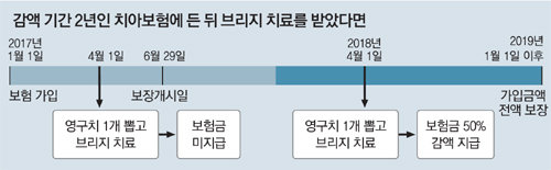하지만 치아보험의 혜택을 제대로 받으려면 우선 면책과 감액 기간을 확인해야 한다. 면책 기간은 보험사가 보험금을 지급할 의무를 지지 않는 기간이다. 감액 기간은 보험금의 일부만 지급해도 되는 기간을 말한다. 이런 기준을 둔 것은 치아 관련 질환이 있는 사람이 바로 보험금을 받으려고 보험에 가입하는 것을 막기 위해서다.