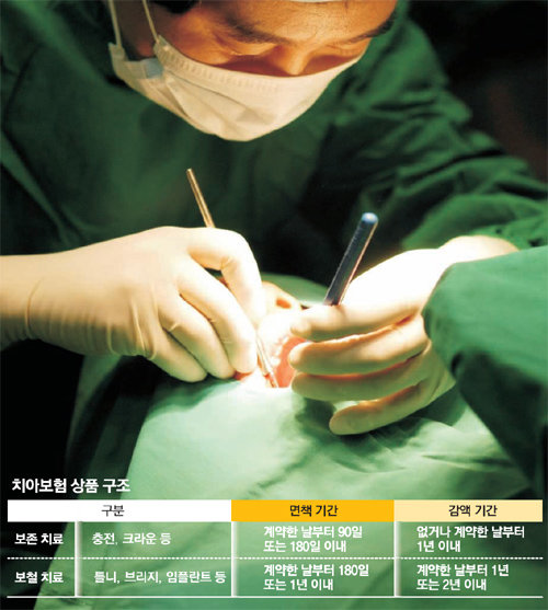 대개 치아 일부를 때운다고 하는 충전 치료나 치아 전체를 금속 등으로 덧씌우는 크라운 치료 등과 같은 보존 치료는 보험 계약을 한 날부터 90일 또는 180일까지 면책 기간이다. 면책 기간이 지났지만 보험 계약을 하고 1년을 채우지 못했다면 보험금을 50% 감액해서 받게 된다. 틀니나 임플란트, 브리지(건강한 양쪽 치아를 지지대 삼아 의치를 고정시키는 방법) 등의 보철 치료는 보존 치료보다 면책 및 감액 기간이 더 긴 편이다.