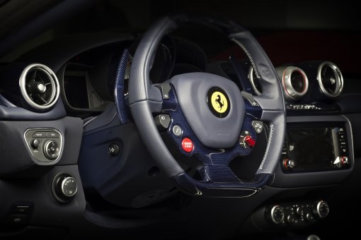 캘리포니아 T의 실내에도 두 가지 메인 컬러가 적용됐다. 시트는 차의 전체 테마와 마찬가지로 짙푸른 블루 컬러로 마무리 됐고, 두 줄의 화이트 스트라이프를 넣어 외관 디자인과 흐름을 같이한다. 시트에는 마이크로 프레스티지(Mycro Prestige)라는 신소재가 적용됐다. 페라리만을 위해 특수 개발된 소재로 일반 가죽에 비해 무게는 3분의 1에 불과하고, 방염〮방수 기능은 물론, 미세한 구멍이 뚫려 있어 오랫동안 쾌적함을 유지할 수 있는 장점까지 갖췄다.