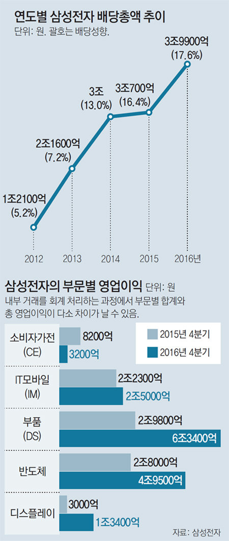 삼성전자는 이날 사상 최대의 현금배당도 발표했다. 중간배당을 포함한 2016년 주당 배당금은 보통주 1주당 2만7500원(우선주는 주당 2만7550원)으로 현금배당금 총액은 3조9900억 원이다.
