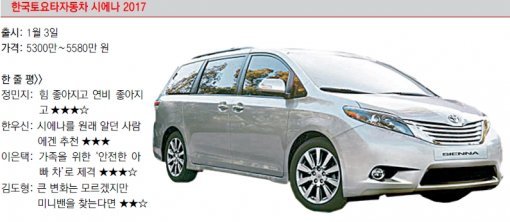 3일 출시된 국내 시장 첫 신차는 한국토요타자동차의 프리미엄 밴 2017 시에나다. 2011년 11월 국내에 처음 선보인 이후 3000대 이상이 팔린 시에나는 이번에 주행성능과 연비를 대폭 개선했다.