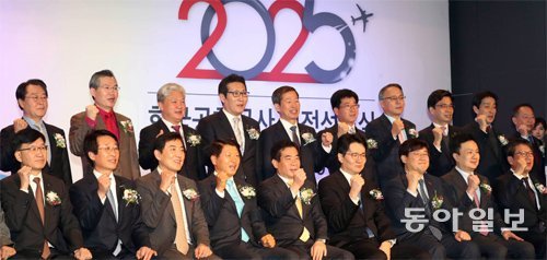25일 서울 강서구 메이필드호텔에서 열린 ‘2025 한국공항공사(KAC) 비전 선포식’에서 참석자들이 주먹을 쥐고 파이팅을 외치고 있다. 공사는 ‘새로운 고객 가치로 미래를 선도하는 공항그룹’으로 도약한다는 비전을 밝혔다. 앞줄 왼쪽부터 한태근 에어부산 사장, 최규남 제주항공 사장, 이연호 KAC 이사회 의장, 성일환 KAC 사장, 서훈택 국토교통부 항공정책실장, 조원태 대한항공 사장, 최정호 진에어 사장, 김종식 이스타항공 사장, 정홍근 티웨이항공 사장.