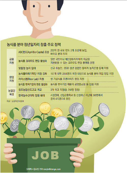 아이디어와 열정을 가진 청년들이 농식품 분야 창업에 도전할 수 있도록 정부가 400억 원 규모의 특화펀드를 조성한다. 농업의 부가가치를 높일 젊은 인재를 양성하기 위한 고등학교도 문을 연다. 미래 성장산업으로 꼽히는 농식품·바이오 분야에서 새로운 일자리를 발굴해 청년실업난을 해소하겠다는 의미다. 현재 장년층 위주의 농업에 신기술과 창조적 아이디어로 무장한 젊은이들이 뛰어들면 새로운 블루오션이 열릴 것으로 기대된다.