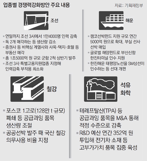 정부는 25일 유일호 경제부총리 겸 기획재정부 장관 주재로 열린 산업 경쟁력 강화 관계장관회의에서 이 같은 내용의 ‘업종별 경쟁력 강화 방안’을 발표했다. 각 부처는 이 방안을 액션플랜(실행계획) 삼아 4대 취약업종(조선 해운 철강 석유화학)의 구조조정에 본격적으로 나설 방침이다.