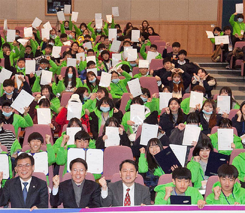 25일 열린 ‘2017년 삼성드림클래스 겨울캠프 수료식’에서 캠프에 참가한 중학생들이 대학생 강사들과 함께 파이팅을 외치고 있다. 삼성그룹 제공