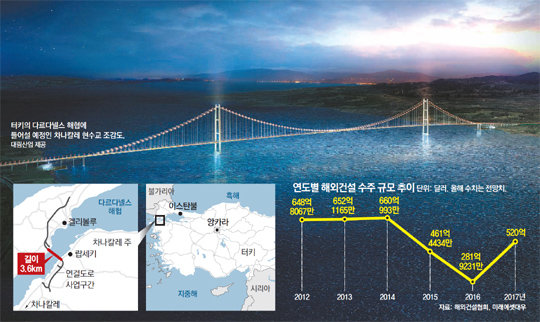 세계에서 가장 긴 현수교를 건설하는 공사를 놓고 한국과 일본이 터키에서 벌인 ‘수주 한일전’에서 한국이 승리했다. 공사비만 3조5000억 원에 이르는 대형 프로젝트다. 설 연휴에 큰 선물이 전달된 것을 계기로 올해 해외건설 수주도 바닥을 치고 회복세를 보일 것으로 기대된다.