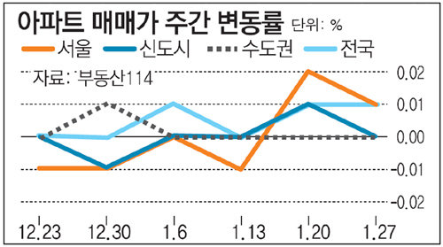 30일 부동산114에 따르면 지난주 서울 아파트 값은 전주 대비 0.01% 오르는 데 그쳤다. 아파트 값이 9주 만에 상승세로 돌아선 전주(0.02%)보다 오름폭이 둔화됐다. 금리 인상의 가능성과 정국 불안 등으로 집을 팔려는 사람과 사려는 사람 모두 관망세를 유지하고 있다. 지역별로는 동대문(0.08%), 송파(0.07%), 영등포(0.07%), 관악구(0.05%) 순으로 아파트 값이 많이 올랐다. 반면 성동(―0.07%), 성북(―0.01%), 강남(―0.01%), 서대문구(―0.01%)는 수요가 뜸해지며 가격이 떨어졌다.