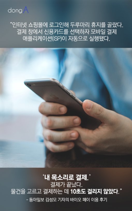 #2 "인터넷 쇼핑몰에 로그인해 두루마리 휴지를 골랐다. 결제 창에서 신용카드를 선택하자 모바일 결제 애플리케이션(ISP)이 자동으로 실행됐다. '내 목소리로 결제.' 결제가 끝났다. 물건을 고르고 결제하는 데 10초도 걸리지 않았다." - 동아일보 김성모 기자의 바이오 페이 이용 후기