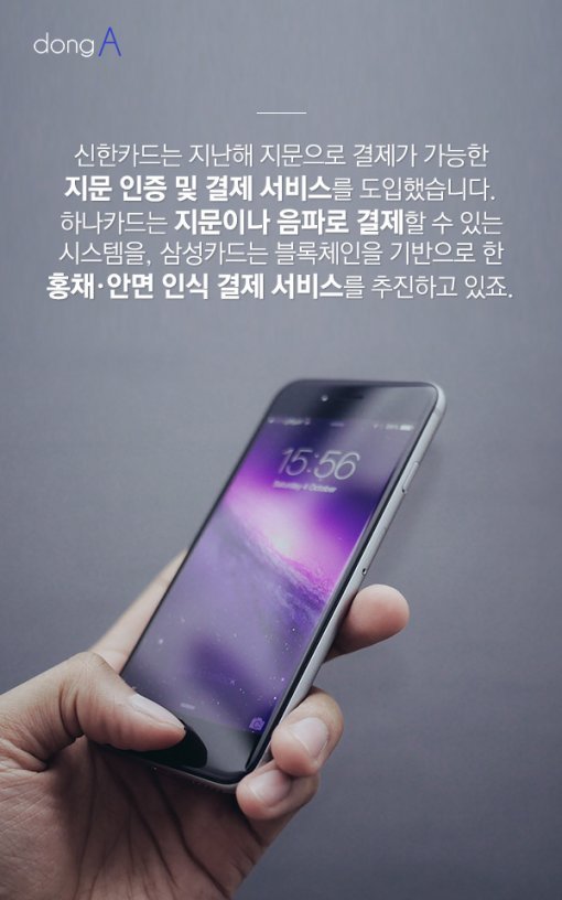 #8 신한카드는 지난해 지문으로 결제가 가능한 지문 인증 및 결제 서비스를 도입했습니다. 하나카드는 지문이나 음파로 결제할 수 있는 시스템을, 삼성카드는 블록체인을 기반으로 한 홍채·안면 인식 결제 서비스를 추진하고 있죠.