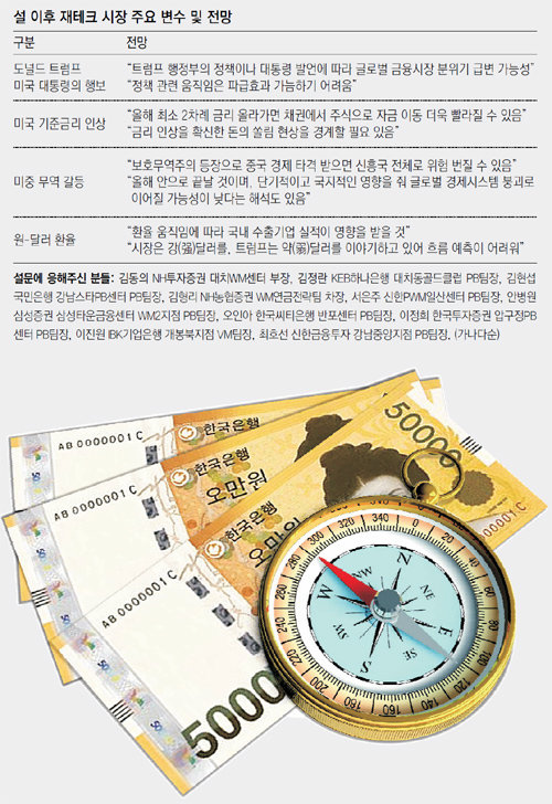 국내 대기업에 다니는 김모 씨(40)는 최근 설 상여와 연차 보상금 등으로 500만 원을 손에 쥐었다. 목돈이 생겼지만 국내 정치 경제적 상황과 원-달러 환율, 도널드 트럼프 미국 대통령의 행보 등 불안한 변수가 많아 투자를 주저하고 있다. 김 씨와 같은 소액 투자자들을 위한 설 연휴 이후 재테크 전략을 국내 은행과 증권사 프라이빗뱅커(PB) 10명에게 물었다. Q. 500만 원이면 비교적 소액이니 상품 하나를 골라 투자하면 간단하지 않은가.
