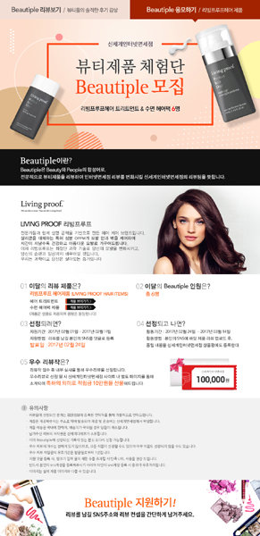 뷰티플 체험단의 2월 리뷰 제품은 헤어 케어 브랜드 ‘리빙 프루프’의 헤어 트리트먼트와 수면 헤어팩이다. 리빙프루프 체험단 응모는 14일까지 신세계인터넷면세점 체험단 모집 페이지에 리뷰를 올릴 자신의 SNS를 댓글로 등록하면 완료된다. 활동 방법은 체험단으로 선정된 후, 24일부터 3월 14일까지 SNS에 제품 리뷰를 업로드하고 동일 내용을 신세계인터넷면세점 상품평에 등록하면 된다.