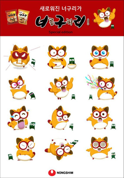 농심은 2월 10일부터 3월 9일까지 농심과 카카오톡 플러스친구를 맺은 소비자들에게 선착순으로 카카오톡 이모티콘을 제공한다고 밝혔다. 카카오톡 플러스친구에서 ‘농심’을 친구 추가하면 선착순 10만명에게 너구리 이모티콘을 증정하며, 함께 나오는 퀴즈의 정답을 맞춘 소비자들 중 추첨을 통해 너구리 담요와 쿠션, 너구리큰사발 제품 등 푸짐한 경품도 지급한다. 이번에 제공하는 카카오톡 이모티콘은 지난 1월 리뉴얼 이후 입체적으로 변신한 너구리 캐릭터와 새롭게 탄생한 다시마 캐릭터의 다양한 표정이 친근하게 묘사되어 있다.