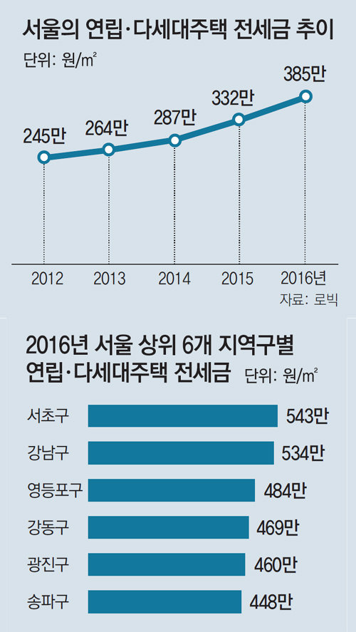로빅에 따르면 지난해 서울 연립·다세대주택의 전세금은 전년(m² 기준·332만 원) 대비 15.9% 오른 385만 원이다. 2012년(245만 원)과 비교하면 57.1% 오른 것이다. 같은 기간 매매가는 404만 원에서 476만 원으로 17.8% 올랐다. 업계에서는 연립·다세대주택을 신혼부부나 독신자들이 임차용으로 주로 찾기 때문에 전세금이 매매가보다 상승폭이 컸던 것으로 풀이하고 있다.