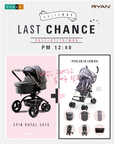 에이원 유모차 브랜드 ‘리안’이 15일 오후 12시40분 현대홈쇼핑 ‘프리미엄 유모차 특별 방송’에서 최고급 디럭스 유모차 ‘스핀 로얄’을 판매한다. ‘스핀 로얄’ 유모차 구매 시 휴대용 유모차를 추가로 증정하는 게 특징. 방송 시간 동안 34% 할인된 52만7000원에 판매하며, 구매 후 간단한 후기를 남긴 고객 전원에게 리안 휴대용유모차 ‘이지’를 추가 증정한다. 더불어 필수 유모차 액세서리인 ‘풋머프’, ‘양면 이너시트’, ‘캐리콧커버’, ‘멜란지 방풍커버’, ‘모기장’, ‘유모차 정리함’ 등 6종의 사은품도 제공한다.