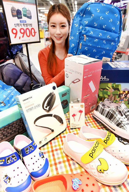 14일 서울 강서구 화곡로 홈플러스 강서점에서 모델이 어린이를 위한 신학기 상품들을 들어보이고 있다. 홈플러스는 16일부터 다음 달 1일까지 ‘신학기 필수품 기획전’을 열고 의류, 잡화 등을 할인 판매한다.