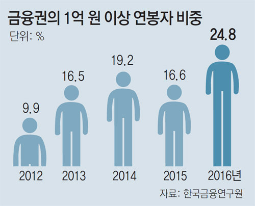 15일 한국금융연구원이 내놓은 ‘2016년 금융 인력 기초 통계 분석’ 보고서에 따르면 지난해 금융회사 직원 가운데 1억 원 이상의 연봉을 받은 직원이 24.8%로 조사됐다. 연봉 1억 원 이상 직원의 비중은 4년 전인 2012년(9.9%)에 비해 크게 늘었다. 지난해보다 8.2%포인트 증가한 것으로 나타났다. 이는 금융연구원이 지난해 9∼12월 은행·보험·증권 등 7개 금융업권 1389개 사를 대상으로 설문 조사한 결과다.