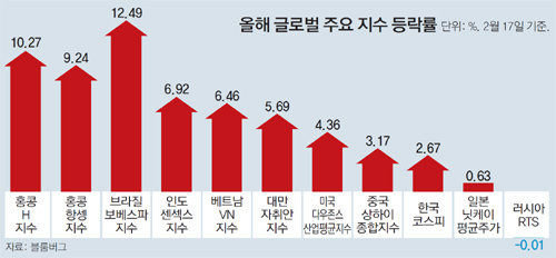 20일 블룸버그에 따르면 H지수는 연초부터 17일까지 10.27% 상승했다. 같은 기간 한국 코스피는 2.67% 오르는 데 그쳤다. 중국 상하이종합지수(3.17%), 일본 닛케이평균주가(0.63%) 등도 H지수보다 상승률은 낮았다. 연초 9,000 선 초반에 머물던 H지수는 이달 들어 10,000 선을 넘으며 강세를 보이고 있다. 지난해 2월 7,500 선까지 떨어졌던 것과 비교하면 완연한 회복세다. 글로벌 주요 증시 중에서 브라질에 이어 두 번째로 높은 수준이다. 최근 연일 사상 최고치를 경신하고 있는 미국 다우존스산업평균지수보다도 상승폭이 크다. H지수의 상승세로 관련 금융상품의 올해 수익률이 큰 폭으로 뛰고 있다. 펀드평가사 제로인에 따르면 ‘미래에셋 인덱스로차이나H레버리지2.0’ 펀드는 올해 들어 22.93%의 수익률을 내고 있다. 지수 상승률에 2배의 수익을 주는 레버리지 구조 덕분이다. H지수 자체를 투자 상품으로 하는 인덱스 펀드인 ‘KB스타 차이나H인덱스’ ‘신한BNPP 차이나인덱스’도 올해 두 자릿수 수익률을 내고 있다.