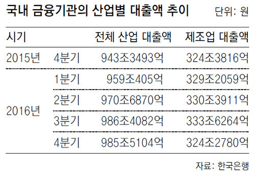 지난해 4분기(10∼12월) 은행 등 금융권이 기업 대출을 크게 줄인 것으로 나타났다. 특히 제조업 대출이 직전 분기보다 9조3000억 원 줄어 관련 통계를 집계하기 시작한 2008년 이후 감소 폭이 가장 컸다.