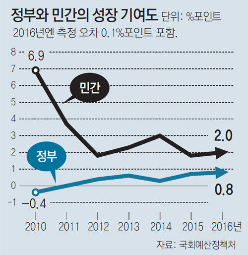 기업, 가계 등의 경제활동이 움츠러들면서 정부가 경제성장에서 활약한 비중은 커졌다. 2010∼2015년 정부의 평균 성장 기여도는 0.3%포인트였지만 지난해에는 0.8%포인트(측정 오차 0.1%포인트 포함)로 배를 넘었다. 실제로 정부는 지난해 ‘쥐어짠다’는 말이 어울릴 정도로 다양한 부양책을 폈다. 11조 원의 추가경정예산을 투입하고 자동차 개별소비세 인하, 쇼핑 관광축제 ‘코리아 세일 페스타’ 실시 등이 대표적인 예다. 추경 편성 등의 영향으로 지난해 정부 소비는 1년 전보다 3.9% 늘어 글로벌 금융위기 직후인 2009년(5.2%) 이후 7년 만에 최고치를 보였다.