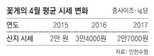국립수산과학원 서해수산연구소는 올해 4∼6월 인천 해역에서 잡힐 꽃게의 어획량을 지난해 같은 기간 어획량(893t)의 2배 수준인 1500∼2000t가량으로 전망했다. 이에 따라 실제 4월 초 꽃게 산지 시세는 지난해보다 20%가량 내려갔다.