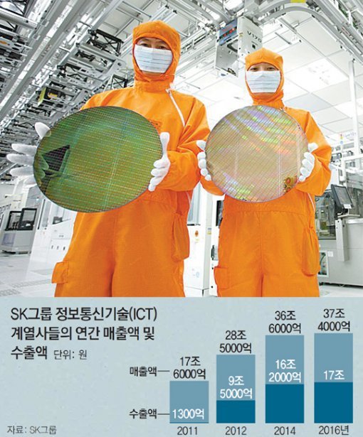9일 SK그룹에 따르면 SK텔레콤, SK하이닉스, SK㈜ C&C사업, SK플래닛 등 그룹 내 ICT 계열사들은 지난해 총 37조4000억 원의 매출액을 올렸다. 이 중 17조 원(45.5%)이 수출액이었다. 지난해 ICT 부문 수출액은 그룹 전체 수출액의 약 3분의 1을 차지했다. 2014년부터 이어진 저유가 기조로 에너지·화학 부문 수출액이 줄어드는 사이 ICT 부문이 든든한 버팀목 역할을 해 준 것이다.
