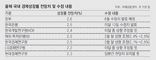 이에 앞서 한국경제연구원은 올 성장률 전망치를 당초 2.1%에서 지난달 말 2.5%로 0.4%포인트나 올려 잡았다. 올해 전망치를 2.2%로 내놓은 LG경제연구원도 상향 조정을 검토하고 있다. 국책 연구원인 한국개발연구원(KDI)도 이달 중 발표할 경제전망에서 기존 전망치(2.4%)를 올려 잡을 것이라는 관측이 우세하다.