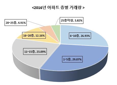 부동산전문 리서치업체 리얼투데이가 국토교통부 2016년 수도권(서울, 경기, 인천) 아파트의 거래 현황을 조사한 결과 작년 한 해 동안 1~5층 저층 아파트가 전체 층고대비 거래가 가장 활발했던 것으로 나타났다. 5층 이하 저층 아파트 거래량은 총 2만865건으로 전체 거래량 7만1775건의 29.07%를 차지했다. 이어 △6~10층 26.93% △11~15층 23.09% △16~20층 12.16% △20~25층 4.91% △25층 이상 3.82% 순으로 거래가 많았다.