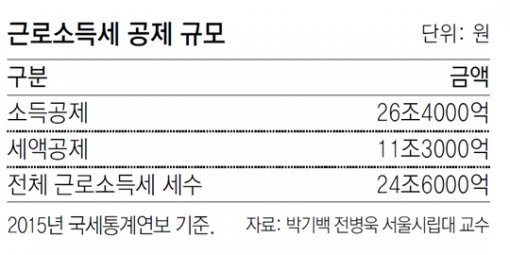 반면 근로소득세에서 소득공제로 깎아준 세금은 26조4000억 원에 이르는 것으로 산출됐다. 세액공제액은 11조3000억 원이었다. 결과적으로 각종 공제로 걷지 않은 세금이 37조7000억 원에 달하는 셈이다. 박 교수는 “산술적으로 공제가 없었다면 38조 원의 세금을 더 걷을 수 있었다는 의미”라고 설명했다.