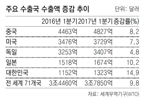21일 세계무역기구(WTO)에 따르면 한국의 올해 1분기 수출액은 1323억 달러(약 148조5729억 원)로 지난해 같은 기간보다 14.9% 증가했다. 이는 세계 수출액 상위 10개국 중에서도 가장 높은 수치다. 최근 경기 회복세를 보이는 중국의 수출액은 8.2%, 수출 2위인 미국은 7.3%가 늘어난 데 비해 두 배 이상 가파른 증가율을 보였다.