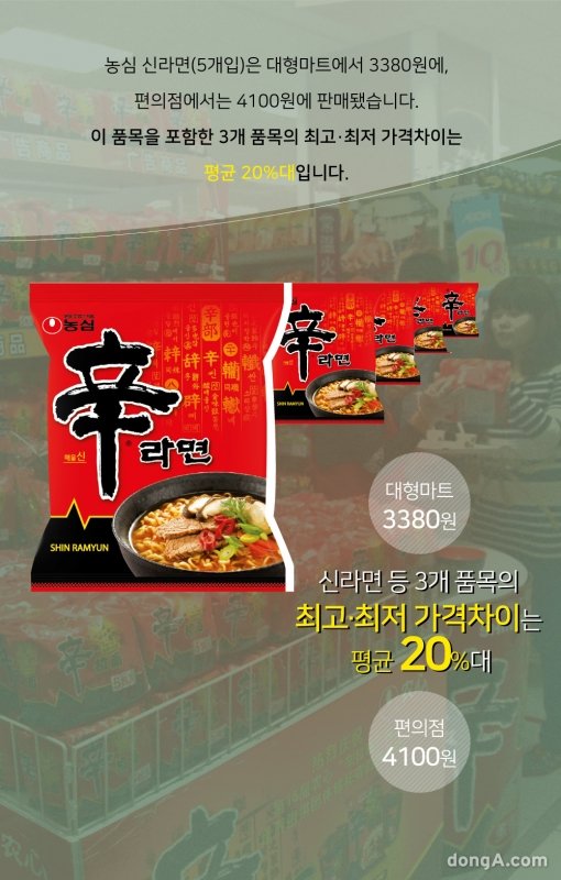# 농심 신라면(5개입)은 대형마트에서 3380원에, 편의점에서는 4100원에 판매됐습니다. 이 품목을 포함한 3개 품목의 최고·최저 가격차이는 평균 20%대입니다.