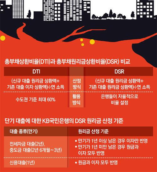 은행권도 조기 도입을 대비하고 있다. KB국민은행은 4월부터 DSR(한도 300%)를 시범 운영 중이다. 나머지 은행들은 국민은행의 시범 실시 결과를 참고해 대출 유형별 적정 비율을 정할 계획이다. 한 시중은행 관계자는 “DSR를 도입하기 위한 전산체계 개발을 이미 완료했다”고 말했다.