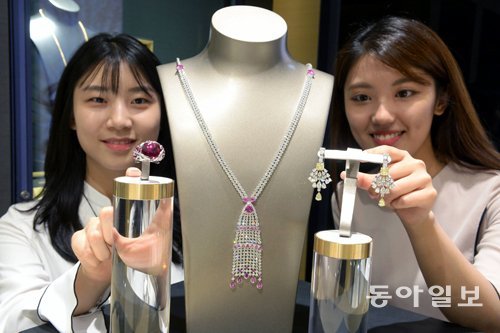 27일 서울 강남구 현대백화점 본점에서 열린 ‘피아제 하이 주얼리 전시’에 5억 원을 훌쩍 넘는 목걸이와 귀걸이가 눈길을 끌었다. 다이아몬드 474개와 핑크빛 사파이어 29개로 이뤄진 ‘라임라이트 파리 뉴욕 네크리스’는 5억6150만 원, 다이아몬드 20.21캐럿으로 세팅된 ‘익스트림리 피아제 이어링’은 6억6850만 원이다.