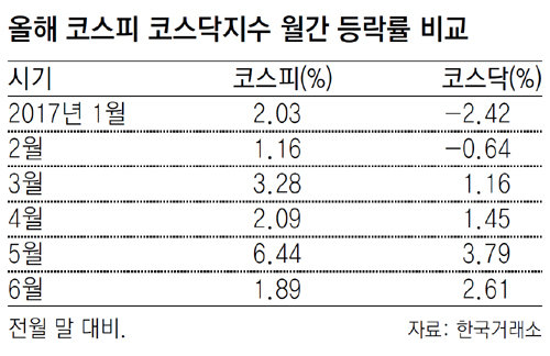 올해 들어 코스피가 연일 사상 최고치 기록을 갈아 치우는 등 뜨거운 상승랠리를 이어가는 동안에도 코스닥은 상대적으로 잠잠한 편이었다. 코스피는 월간 기준으로 지난해 12월부터 7개월 연속 상승했지만 코스닥은 올해 3월부터 상승세를 탔다. 기대를 모으는 건 새 정부 출범과 함께 코스닥 시장에도 온기가 돌고 있다는 것이다. 6월의 경우 코스피가 1.89% 오르는 동안 코스닥은 2.61% 상승했다.
