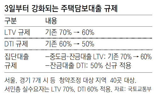 6·19대책에 따라 3일부터 서울과 경기 7개 시, 부산 7개 구 등 40곳의 ‘청약조정 대상 지역’에서 대출 규제가 강화된다. 일반 주택담보대출을 받을 때 주택담보인정비율(LTV)은 기존 70%에서 60%로, 총부채상환비율(DTI)은 60%에서 50%로 각각 강화된다. 3일부터 입주자 모집 공고를 하는 새 아파트는 잔금 대출에 DTI 50%가 새로 적용된다.